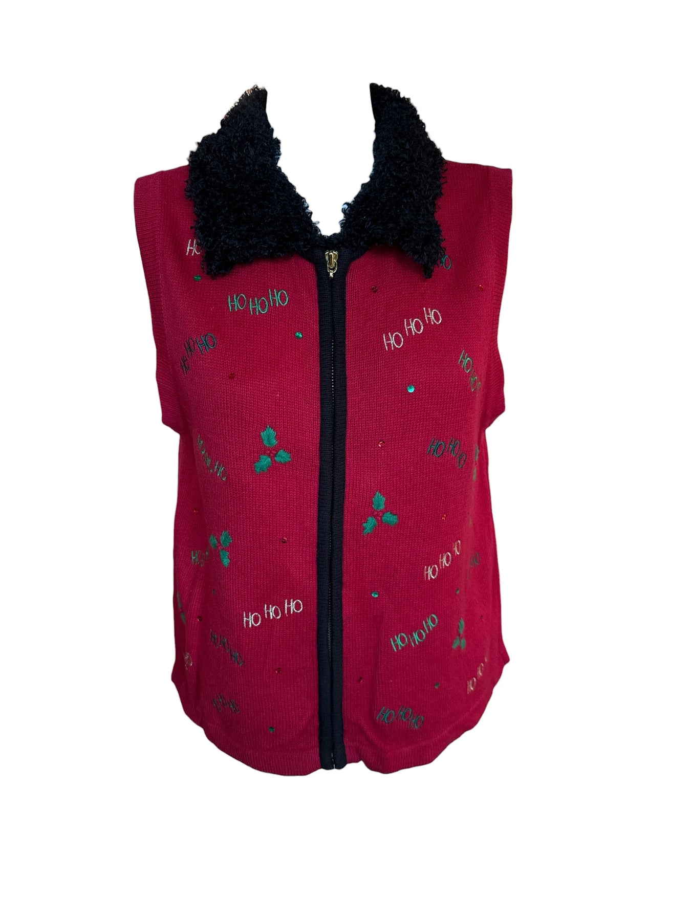 Rautt jólavesti með svörtum kraga og texta sem segir hohoho