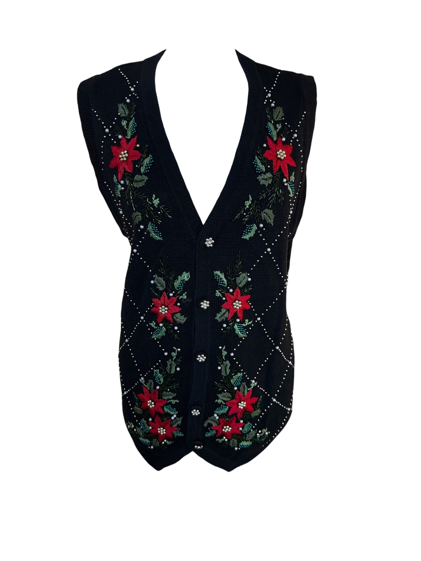 Svart jólavesti hneppt með allskonar bling og blómum