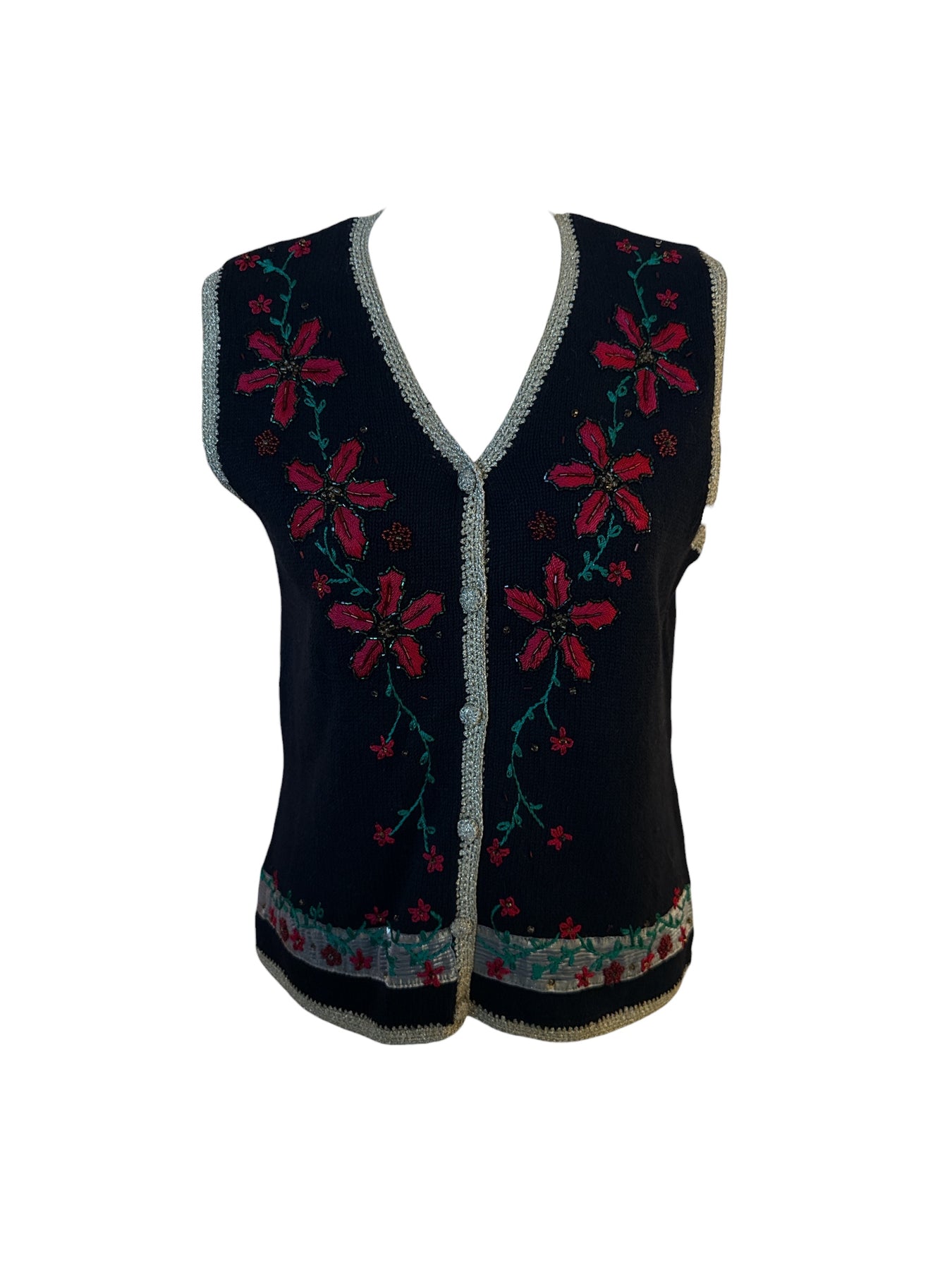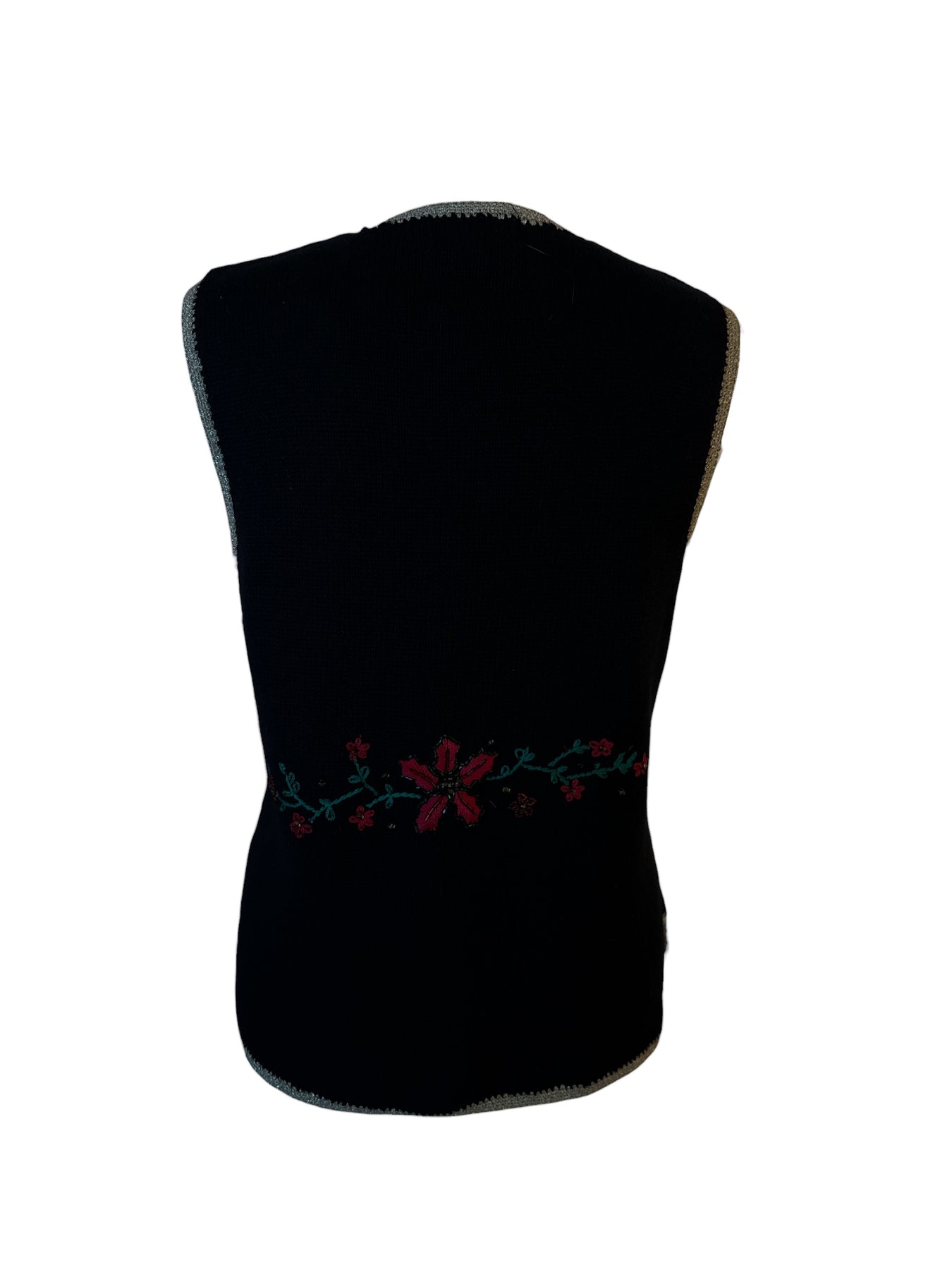 Svart hneppt jólavesti með gylltu og rauðu skrauti