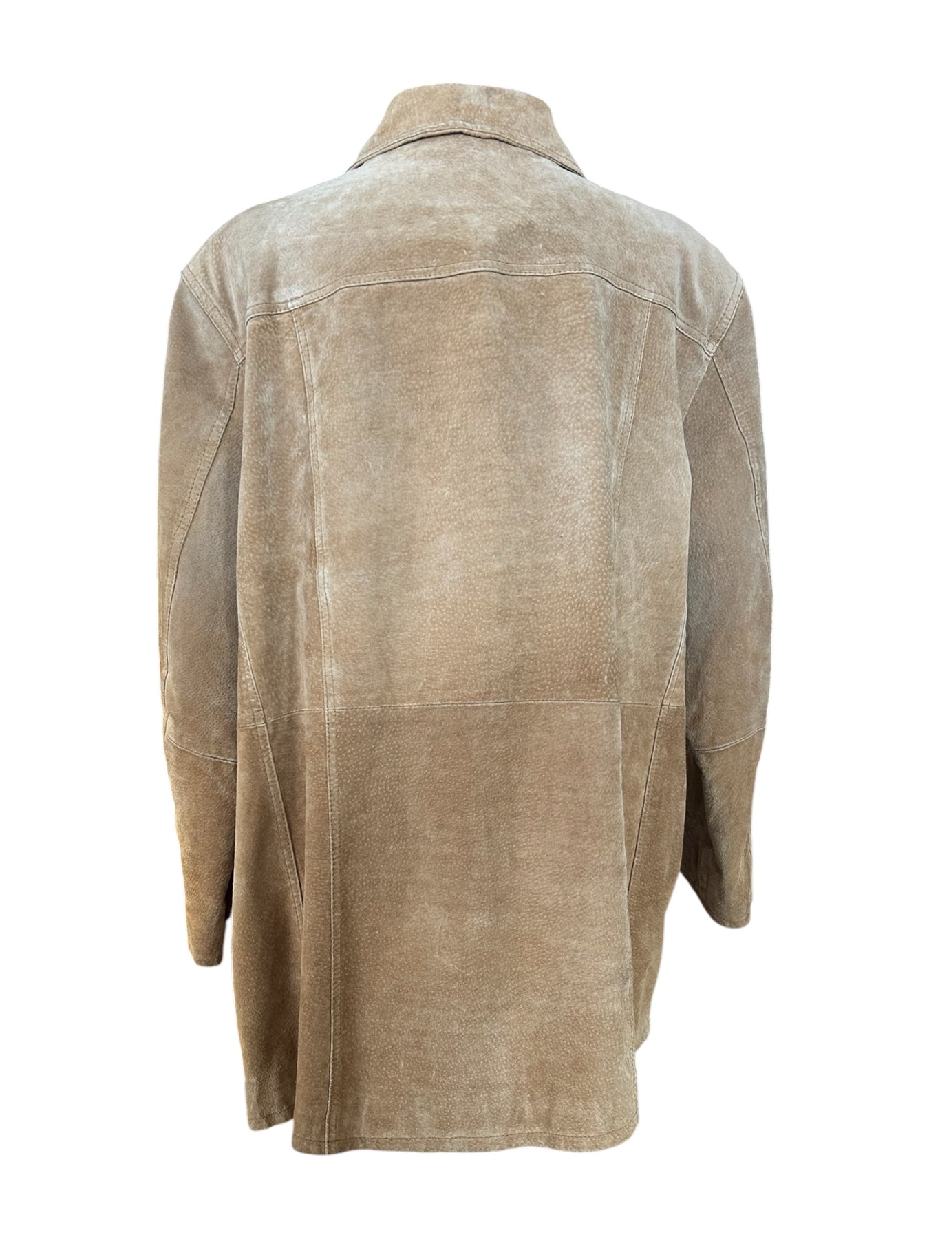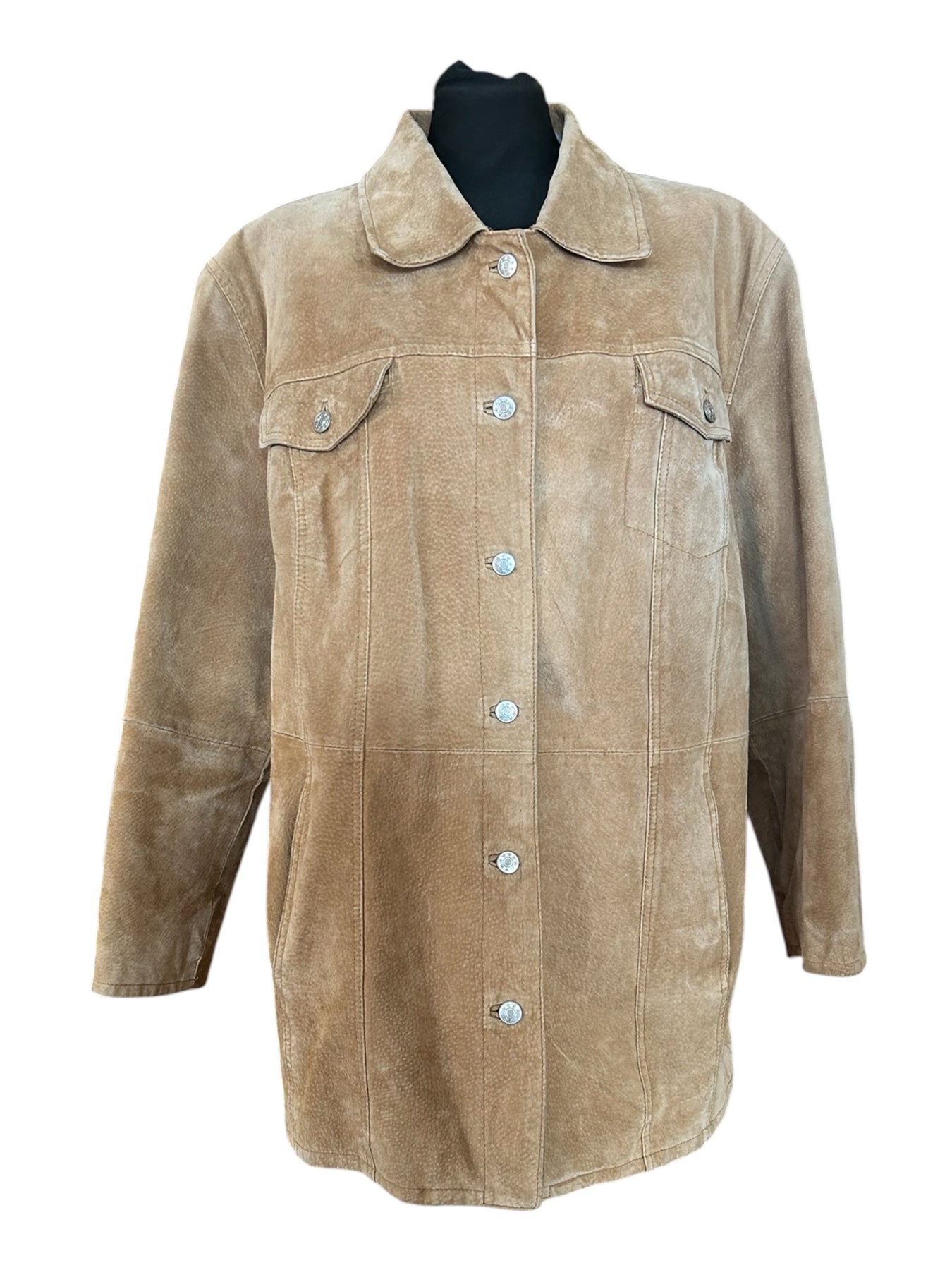 Hnepptur rúskinnsjakki, fjóri vasar framan á.